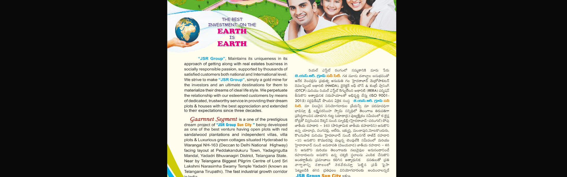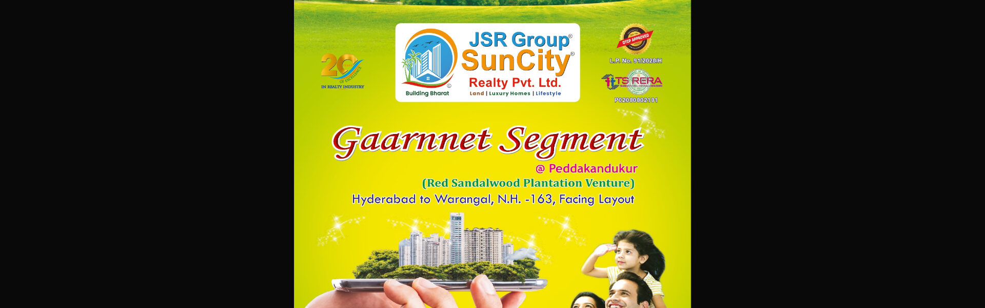 Gaarnnet Segment Project at SunCity is an eagerly awaited and distinctive venture by JSR Group Sun City designed to provide a luxurious and tranquil living experience in Telangana State. This remarkable project is strategically situated at Wangapally Junction in Yadagirigutta Mandal, Yadadri Bhuvanagiri District, featuring an impressive selection of open plots with red sandalwood plantations, independent villas, villa plots, and opulent green cottages.