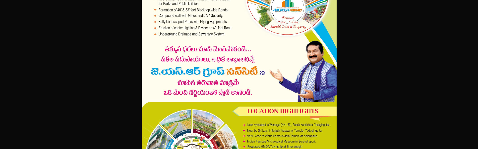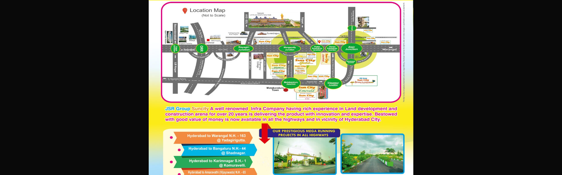 JSR Group Sun City is the most accomplished and trusted real estate company, offering DTCP/RERA approved layouts for both residential and commercial plots near Shamshabad, Hyderabad, Wangapally, Peddakaaparthy and Yadagirigutta.