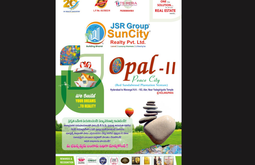 Introducing Opal by JSR Group SunCity, a remarkable and eco-friendly gated community that offers premium villa plots for sale. Located in the charming neighborhood of KOLANUPAKA, near Yadagirigutta, Opal has obtained DTCP and RERA approvals, guaranteeing reliability and authenticity.