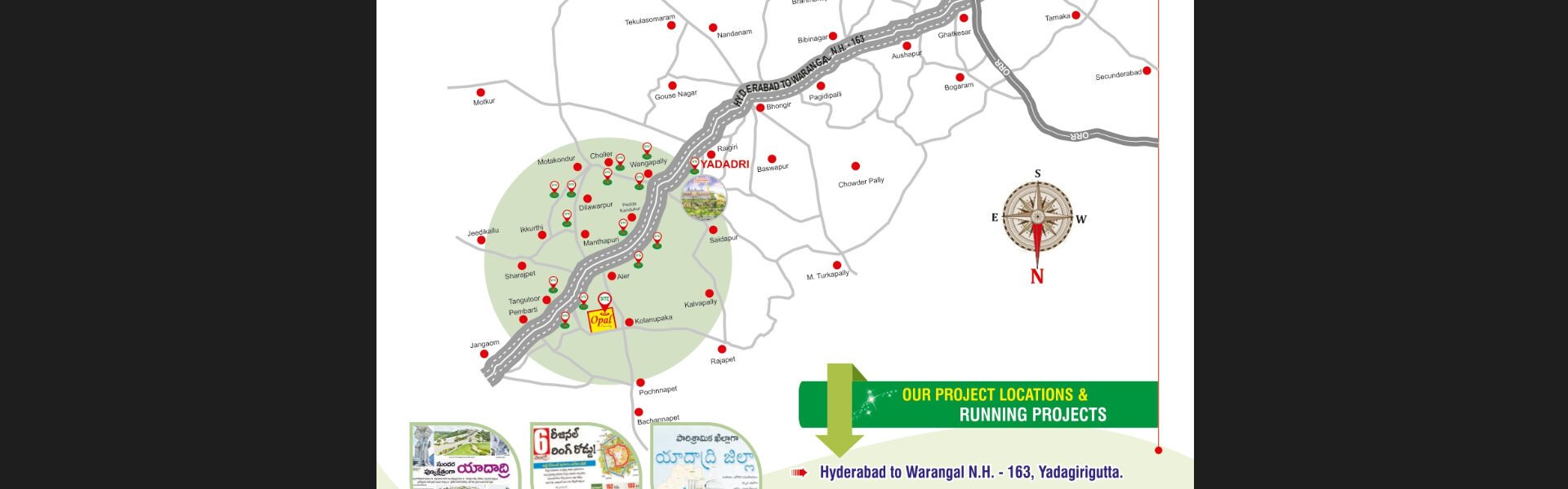 Conveniently positioned along the Hyderabad to Warangal NH-163 (Deccan to Delhi National Highway), Opal provides easy access and serves as an ideal location for both residential and commercial purposes. It is also situated near Telangana’s largest pilgrim Centre, Lord Sri Lakshmi Narasimha Swamy Temple Yadadri, popularly known as Telangana Tirupathi. Additionally, our properties are strategically located in India’s rapidly growing industrial growth corridor, ensuring high returns on investment.