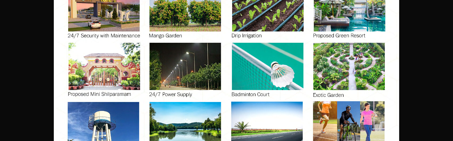 JSR Group Sun City Capital-II has Wide Roads, Foot Paths, Street Lights, Overhead Water Tank and is proposed to be equipped with special amenities like Resorts, Cottages, Guest Houses, Gazebo Sit Outs, Theme Park, Jogging and Walking Tracks, above all are complimented with man-made beautiful lake view. It is altogether a unique experience @CAPITAL-II.