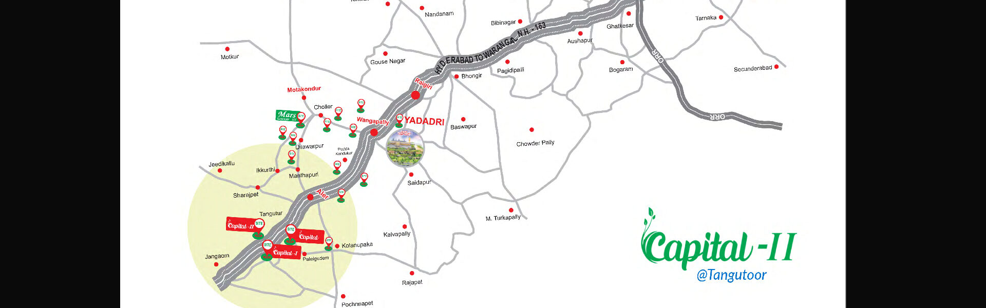 This Venture is being developed with DTCP and RERA approvals and is a spacious gated community facing the National Highway, very close to Alair, a neighborhood of Yadagirigutta.