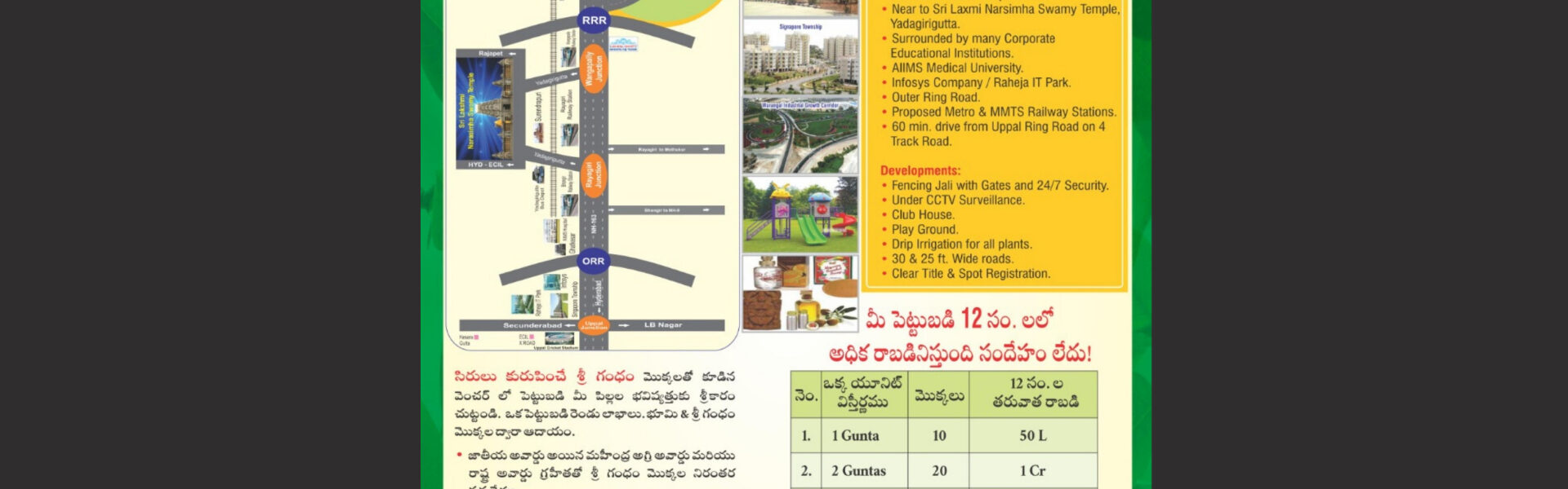 Aler Farm Land near Yadagirigutta offers investors a range of advantages, including the potential for significant returns on investment, favorable legal and regulatory frameworks governing farmland ownership, and a peaceful and serene environment for farming and other activities.