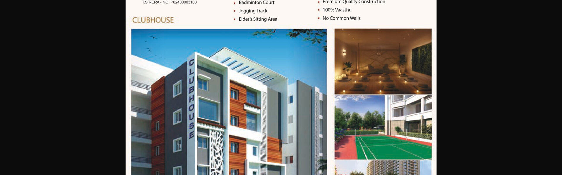 CLUBHOUSE Multi-purpose Hall Gymnasium Meditation /Yoga Children Play Area Indoor Games Badminton Court Jogging Track Elder's Sitting Area Excellent Ventilation Generator for Standby Power Ample car Parking 24 hours Water Supply 24X7 Security Premium Quality Construction 100% Vaasthu No Common Walls