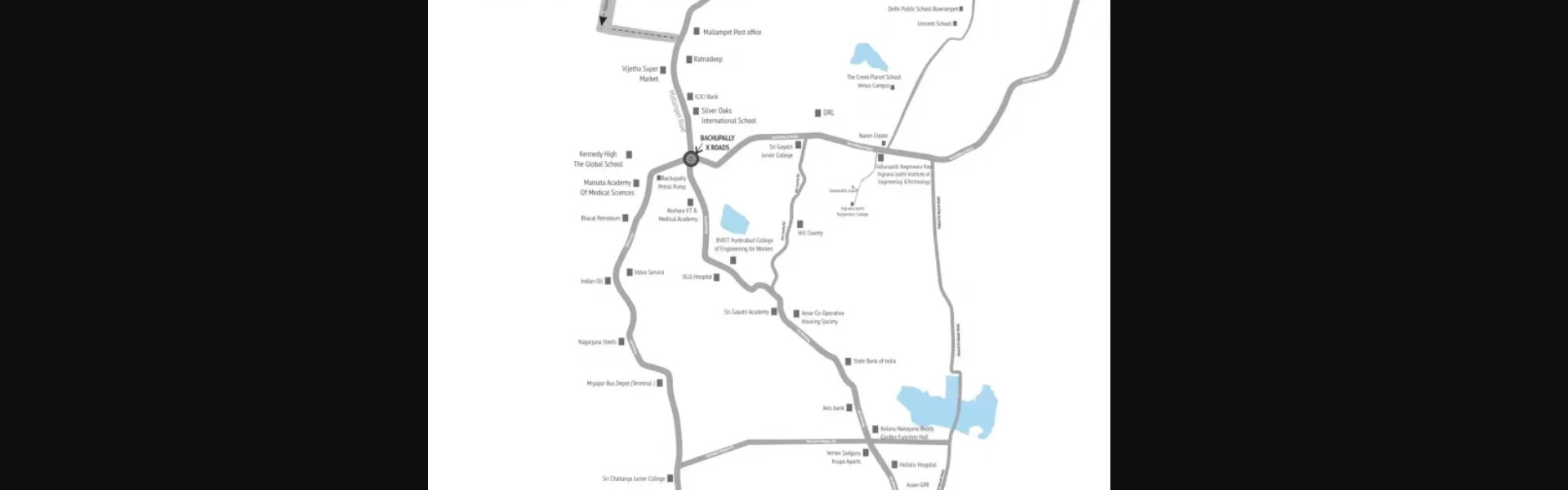 Adj. to Outer Ring Road 7 kms from ICBT, Miyapur 9 kms from Nizampet X Roads and Miyapur Metro 15 kms from HITEC City Close to Mamata Academy of Medical Sciences,SLG Hospital Close to reputed educational Institutions like Oakridge Einstein Campus, Unicent School, Silver Oaks, Creek, DPS, Ambitus, VJIT Engg College.