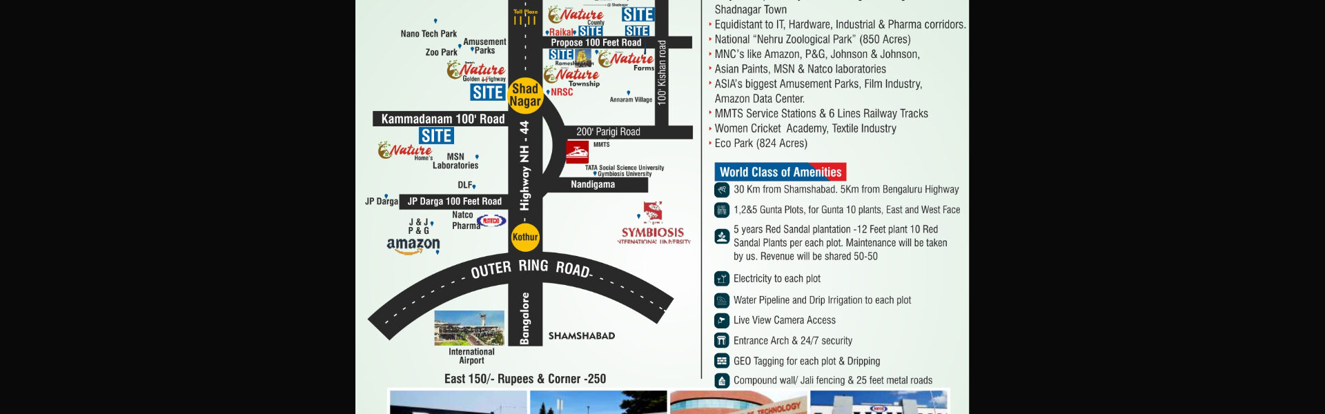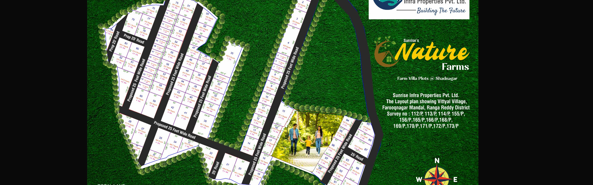 Sunrise’s Nature Farms is a divine serenity. At Sunrise’s Nature Farms, we offer you to choose your destination by buying residential Farms Villa Plots in Shadnagar, to enjoy the essence of nature and the corporate world together. Sunrise’s Nature Farms is located where the locality of Shadnagar is taking a new shape for a new beginning.