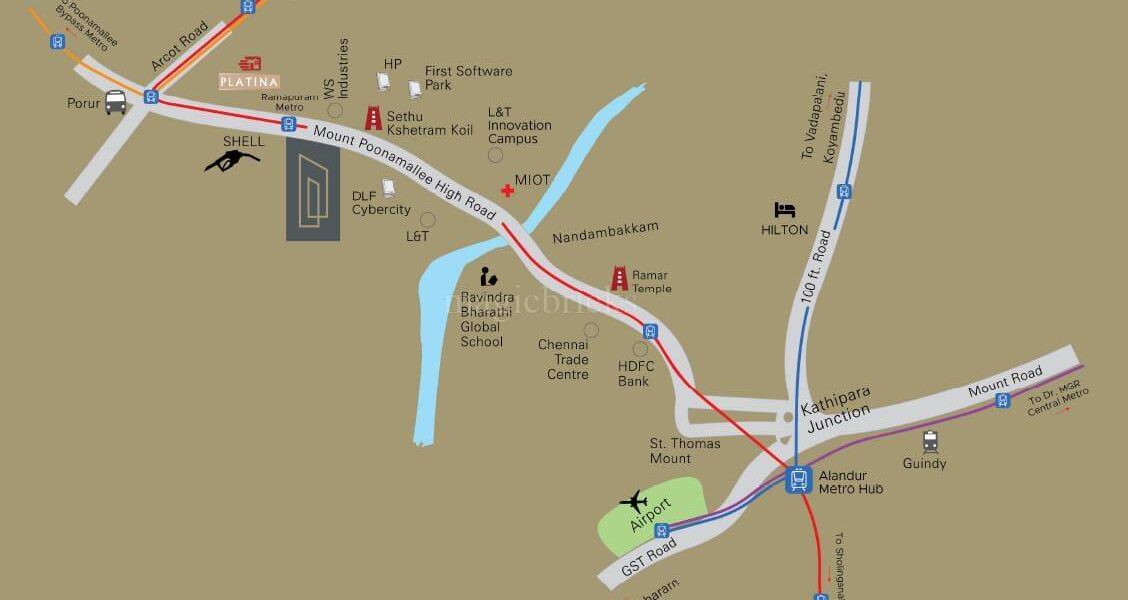 About 5 km from Ekkattuthangal Metro Station via Jawaharlal Nehru Road on Line 2 of Chennai Metro.