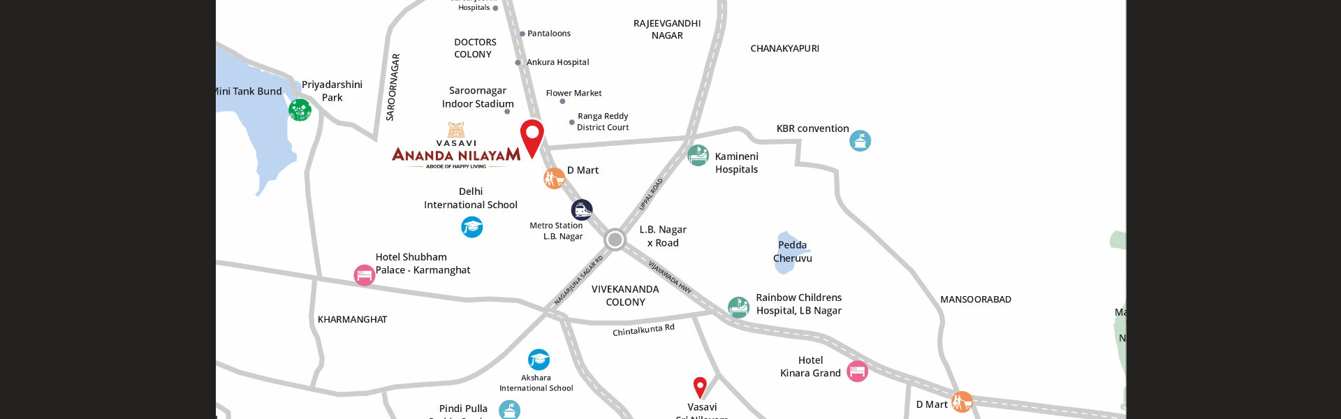 Vasavi Ananda Nilayam – South India’s Largest Gated Community at LB Nagar in Hyderabad, situated right in front of the LB Nagar Metro Station. . The all-feature-packed 2, 3 & 4 BHK apartments and Sky Villas are equipped with the finest infrastructure and crafted for indulgence with a breathtaking unobstructed view of the city.